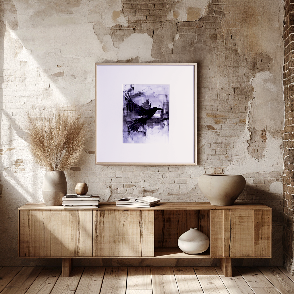 Elevate your walls with the striking energy of Raven’s Flight, a premium giclée print that captures the mystery and grace of nature’s most enigmatic bird. This artwork features fluid brushstrokes and intricate detailing, evoking a sense of freedom and quiet power. Printed on textured fine art paper using archival-quality inks, it ensures exceptional vibrancy and longevity. Encased in a sleek wooden frame with a flat mat, this piece adds depth and sophistication to any space.